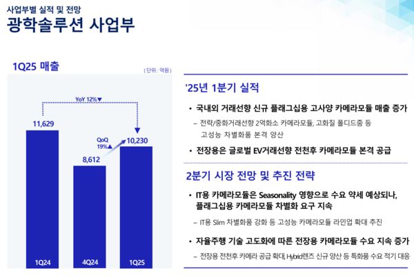 광학솔루션 사업부 역시 1분기 스마트폰 경쟁 도움을 받았다. 글로벌 전기차(EV) 업체 전천후 카메라 모듈 공급도 본격화했다. 하지만 전년동기대비 경쟁 심화로 가격 압박이 커지는 모양새다.
