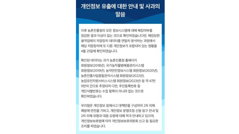 농촌진흥청은 유출 사고 이후 홈페이지에 해킹 사실을 밝히며 비밀번호 변경만 안내하다 농가 회원에게 직접적으로 해킹 사실을 전달한 것은 11일 이후인 21일에서야 문자로 송부한 것으로 드러났습니다.