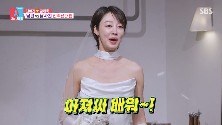 이날 김재욱과 최여진은 남사친 윤종훈과 함께 웨딩드레스 피팅에 나섰다. 윤종훈의 리액션을 보고 최여진은 "리액션 좋아. 아저씨 배워. 저 눈웃음 빨리 배워"라며 김재욱에게 말했다.