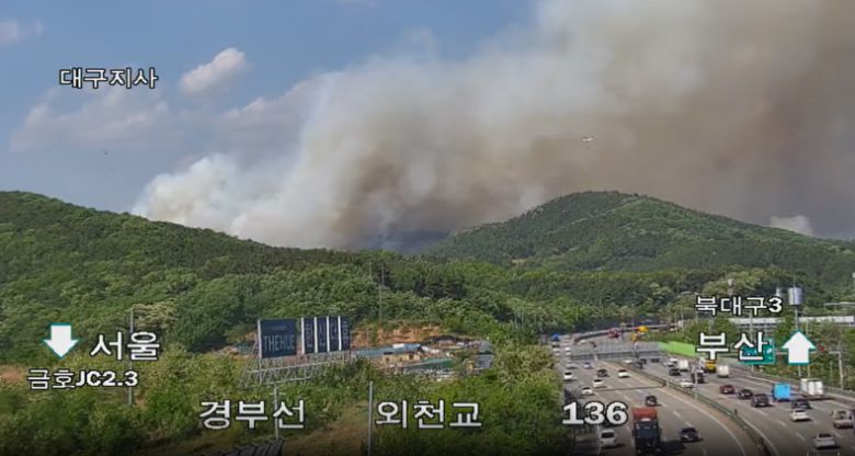 대구 북구 함지산 일대 산불이 이틀째 확산 중인 가운데, 당국이 29일 일출과 동시에 진화 작업을 재개했다. ⓒ국토교통부 CCTV |