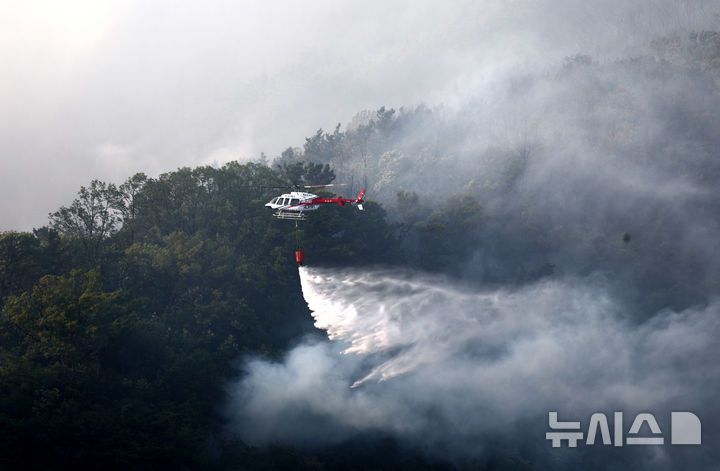[대구=뉴시스] 이무열 기자 = 28일 오후 2시 1분쯤 대구 북구 노곡동 함지산에서 불이 나 소방헬기가 진화작업을 하고 있다. 2025.04.28. lmy@newsis.com |