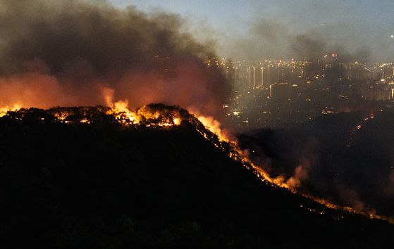 지난 28일 오후 2시 1분께 대구 북구 노곡동 함지산에서 발생한 산불이 야간에도 확산하고 있다. 연합뉴스 |