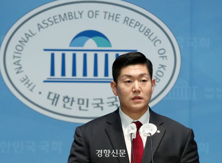 김재섭 국민의힘 의원이 지난해 12월11일 국회 소통관에서 윤석열 대통령 탄핵안에 찬성표를 던지겠다는 기자회견을 하고 있다. 박민규 선임기자