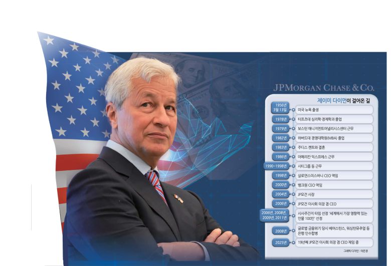 뱅크오브아메리카, 시티그룹, 웰스파고와 함께 미국의 4대 은행으로 불리는 JP모건체이스를 세계 최대 은행 반열에 올리며 2006년부터 20년째 경영해온 그는 미 금융계의 살아있는 전설이자 잠재력이 풍부한 미래 권력으로 간주되고 있다.