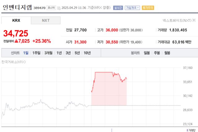 29일 큐라티스는 전일 대비 24.16% 오른 1290원, 인벤티지랩은 25.36% 상승한 3만 4725원에 거래되고 있다.