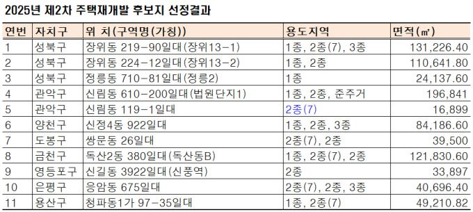 이번 후보지 선정은 주거환경개선이 시급한 지역 중에서 주변과의 연계 개발 필요성, 진출입로 확보 가능 여부, 주민갈등 여부 등을 종합적으로 고려해 사업추진이 용이한 곳을 선정했다.