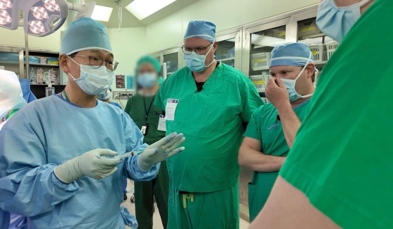 유재두 이대목동병원 교수가 세계 최초 동종 제대혈 유래 줄기세포 치료제 '카티스템'으로 무릎 연골 손상 환자를 수술한 후 방한한 미국 정형외과 전문의에게 수술법을 설명하고 있다. /메디포스트 |