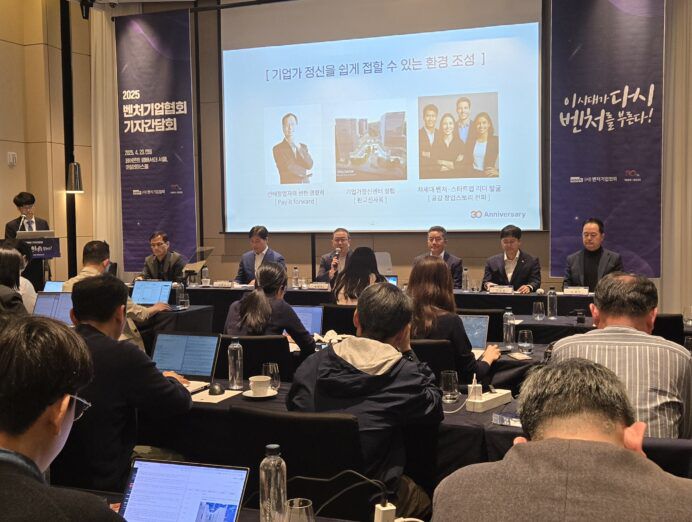 송병준 협회장은 지난 29일 서울 영등포구 페어몬트 앰베서더 서울 아잘레아스홀에서 열린 '2025년 벤처기업협회 기자간담회'에서 벤처업계의 위기를 호소했다. 70여 명의 업계 관계자와 출입기자들이 참석한 가운데 진지한 분위기로 행사가 진행됐다.