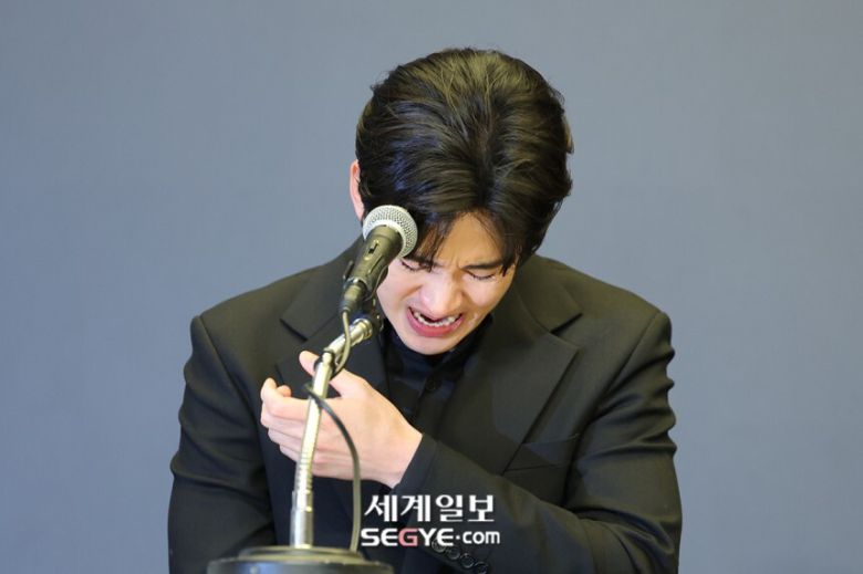 미성년 교제' 의혹에 휩싸인 배우 김수현이 지난 3월 31일 오후 서울 마포구 스탠포드호텔에서 열린 긴급 기자회견에 참석해 입장을 밝히고 있다. 한윤종 기자.