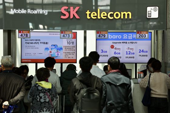 29일 오전 인천국제공항 제1여객터미널 SKT 로밍센터에서 출국자들이 유심 교체을 위해 대기하고 있다. 뉴시스
