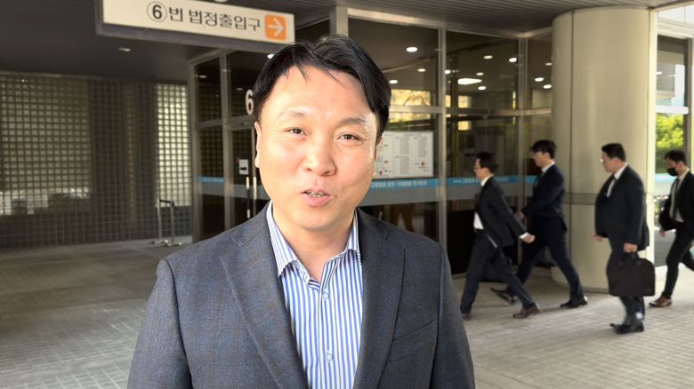 ▲ 2025년 4월 28일 ‘뉴스타파 v. 윤석열’ 사건 봉지욱 기자 2차 공판준비기일 법정 앞. 봉지욱 기자 뒤로 공판 담당 검사들이 지나가고 있다.