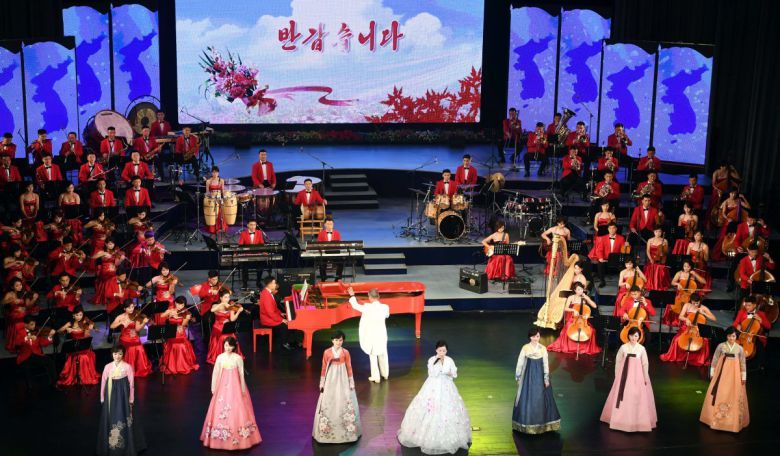 2018년 9월 18일 평양대극장에서 문재인 당시 대통령과 김정은 북한 국무위원장이 참석한 가운데 열린 삼지연 관현악단의 환영 공연에서 단원들이 공연을 펼치고 있다. 뉴스1
