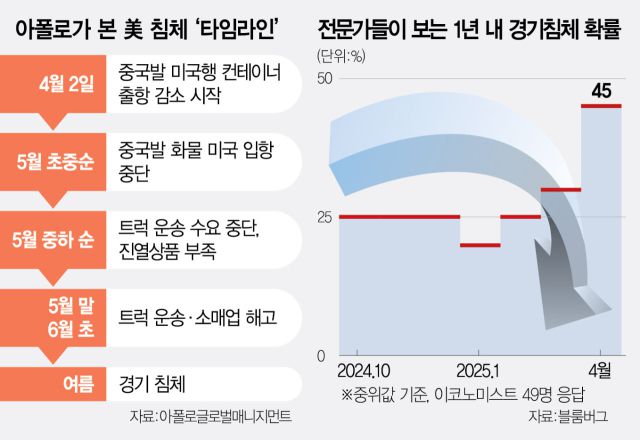 아폴로의 시나리오에 따르면 이달 2일 미국의 상호관세 발표를 시작으로 중국에서 미국으로 향하는 컨테이너선의 출항이 감소한 뒤 다음 달 초순과 중순께 전체 출항이 중단된다. 이 여파로 5월 중순부터는 트럭 운송 수요 감소와 함께 소매점의 진열대가 텅 비는 상황이 현실화될 전망이다. 이는 해당 기업들의 매출 감소로 이어지고 고용 시장으로 전이될 것으로 보인다. 6월 초 트럭 운송 업계와 소매 업계에서 대규모 해고 사태가 나타나고 올여름 미국 경제가 침체에 접어든다는 것이 아폴로의 관측이다.