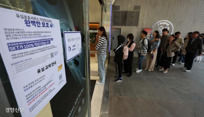 People line up outside an SK Telecom store in Jongno-gu, Seoul, before opening hours on April 28, as the company begins offering free USIM card replacements following the recent hacking incident. By reporter Han Su-bin |