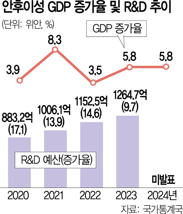 그간 안후이성은 중국 동부 연안 지역의 빠른 성장에 비해서는 다소 뒤처진 모습을 보였다. 하지만 최근 몇 년 새 전기차·반도체·디스플레이·AI·바이오 등 첨단산업을 적극 육성하며 괄목할 만한 성과를 이뤄내고 있다. 비결로는 적극적인 연구개발(R&D) 투자가 꼽힌다. 안후이성의 R&D 예산 증가율은 2020년 17.1%에서 2022년 14.6%, 2023년 9.7% 등으로 다른 지역에 비해 엄청난 규모의 예산을 투입하고 있다.