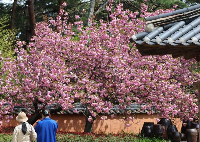 봄이 한창인 24일 강원 강릉시 초당동의 한 고택에 분홍빛 겹벚꽃이 활짝 펴 관광객의 눈길을 사로잡고 있다. [사진=연합뉴스] |