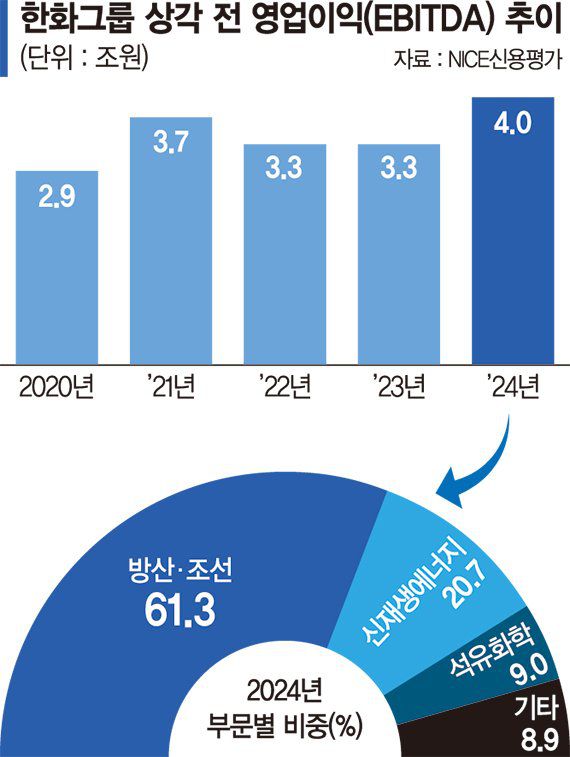 한화그룹의 상각 전 영업이익(EBITDA)이 4조원 시대를 열었다. 특히 방산·조선(한화에어로스페이스, 한화오션)의 비중이 61%를 넘어 그룹의 캐시카우로 자리매김했다는 평가다. 한화그룹은 방산, 조선해양, 우주항공 등 국가적 차세대 핵심 사업에 집중하고 있다.