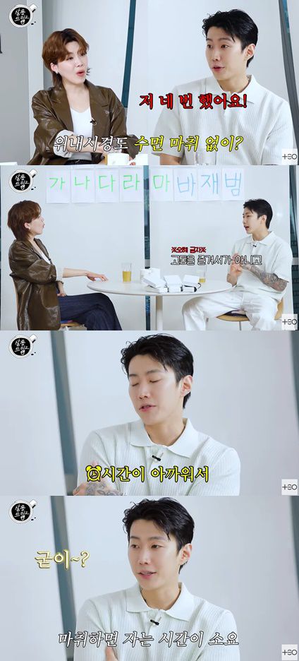 장도연은 "내시경도 수면마취 없이 했다고 하더라"고 물었고, 박재범은 "4번 했다. 고통을 즐겨서가 아니다. 시간이 아까워서다. 4분 안에 끝나는 걸 마취하면 굳이 50분동안 자는 거다"고 말했다.
