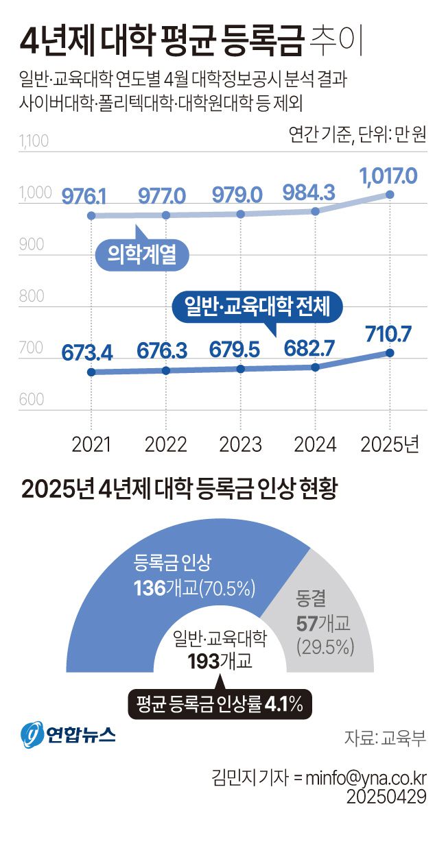 교육부와 한국대학교육협의회가 29일 발표한 ‘2025년 4월 대학정보공시 분석 결과’를 보면 올해 4년제 일반 및 교육대학 193개교 중 136개교(70.5%)가 등록금을 인상했고, 57개교가 등록금을 동결했다. 4년제 대학 재학생 한 명이 1년간 부담하는 평균 등록금은 710만 원이다. 지난해 682만 원보다 27만7000원(4.1%) 상승했다. 올해 인상 법정 상한선은 5.49%다. 대다수 대학이 4% 이상 인상을 택했다.