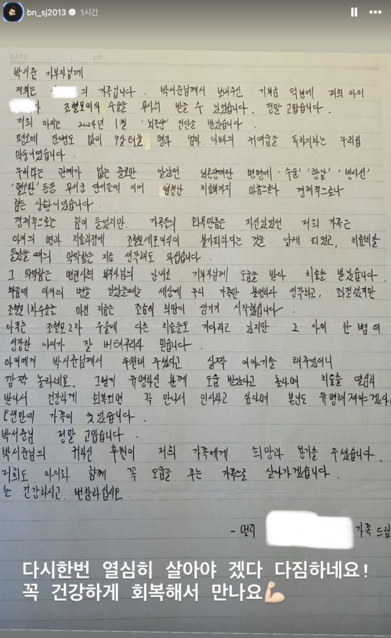 박서준은 29일 자신의 개인 계정을 통해 한 통의 자필 편지를 공개했다. 해당 편지는 박서준의 기부금으로 인해 조혈모이식 수술을 받게 된 환우의 가족이 작성한 편지다. 편지 사진 아래에 박서준은 "다시 한 번 열심히 살아야겠다 다짐하네요. 꼭 건강하게 회복해서 다시 만나요"라고 적기도 했다.
