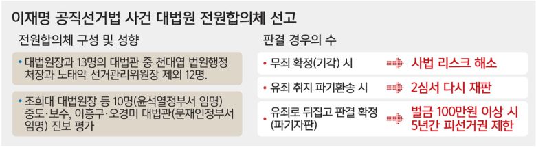 일각에서는 파기자판설도 있긴 하지만, 가능성은 희박하단 평가다. 대법원 재판연구관 출신 한 변호사는 “이 후보 상고심을 이례적으로 서둘러 결정내는 데 대해 ‘파기자판 가능성이 있다’는 관측이 있는 걸 안다”면서도 “이 후보가 ‘프레시 스타트’(fresh start)를 할 수 있도록 해주려는 것이라는 시각이 오히려 설득력이 있어 보인다”고 했다.