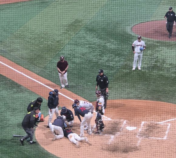 29일 서울 고척돔에서 열린 롯데 자이언츠와 키움 히어로즈전에서 7회 롯데 전민재가 키움 양지율이 던진 공에 머리 부위를 맞고 쓰러져있다. 한동안 일어나지 못하고 발을 구르며 고통을 호소하던 전민재는 응급차를 타고 인근 병원으로 이송됐다. 박성국 기자
