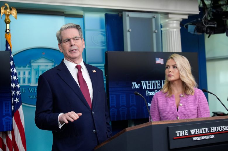 스콧 베선트 미국 재무장관과 캐럴라인 레빗 백악관 대변인이 29일 워싱턴 DC 백악관에서 트럼프 취임 100일 관련 기자회견을 하고 있다. /EPA 연합뉴스