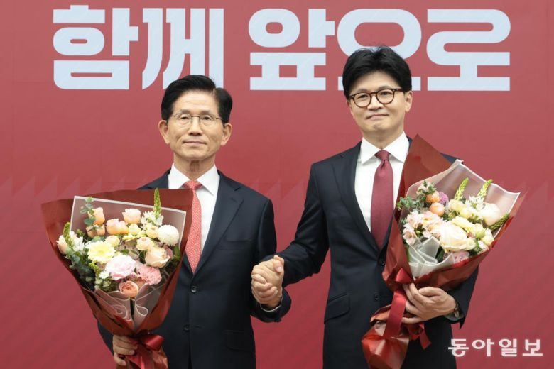 국민의힘 2차 경선 결선에 진출한 김문수, 한동훈 후보가 29일 오후 서울 여의도 중앙당사에서 열린 제21대 대통령후보자 선출을 위한 3차 경선 진출자 발표에서 꽃다발을 들고 기념촬영을 하고 있다. 이훈구 기자 ufo@donga.com