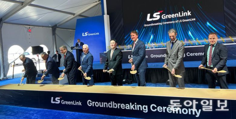 LS전선의 미국 자회사 LS그린링크가 28일(현지 시간) 미국 수도 워싱턴 인근 버지니아주 체서피크에서 해저케이블 제조 공장 착공식을 열었다. 구본규 LS전선 대표이사, 글렌 영킨 버지니아주 주지사, 팀 케인 버지니아주 상원의원, 릭 웨스트 체서피크 시장 등이 힘차게 삽을 뜨자 환호성이 행사장을 가득 채웠다.