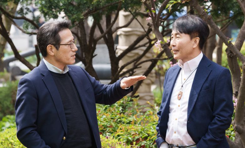 김현우 서울경제진흥원(SBA) 대표(오른쪽)와 정병국 한국문화예술위원회 위원장이 기술과 예술을 융합해 새로운 산업이 성장할 수 있도록 하는 방안에 대해 논의하고 있다. SBA·한국문화예술위원회 제공