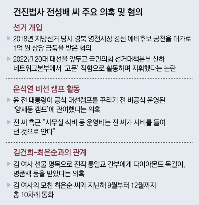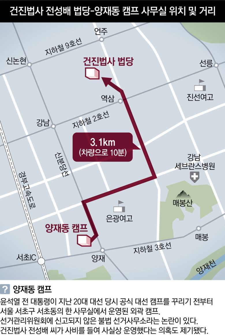 윤석열 전 대통령 부부와 친분을 내세워 이권에 개입했다는 의혹이 제기된 ‘건진법사’ 전성배 씨(65)가 윤 전 대통령의 공식 선거 캠프 출범 전에 꾸려진 비공식 조직, 이른바 ‘양재동 캠프’에서부터 관여했다는 주장이 제기됐다. 전 씨가 양재동 캠프 관련 일부 자금을 댔다는 주장도 나온다. 양재동 캠프가 실제 윤 전 대통령의 선거사무소로 활용됐을 경우 공직선거법 및 정치자금법 위반 논란이 일 것으로 전망된다. 전 씨 측은 돈을 댔다는 의혹을 부인하는 한편 해당 사무소는 선거 캠프가 아닌 ‘팬클럽’ 성격이었다며 반박했다.
