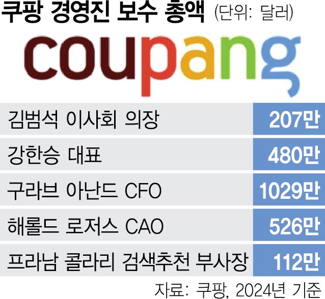 창업자인 김범석 쿠팡Inc 이사회 의장 겸 최고경영자(CEO)의 경우 주택·교통비 등 기타 보상 명목이 늘면서 지난해 보수 총액이 200만 달러를 넘어섰다. 다만 김 의장은 2023년에 이어 2024년에도 보너스와 주식보상을 받지 않았다. 기본급도 110만 달러로 전년과 동일하다.