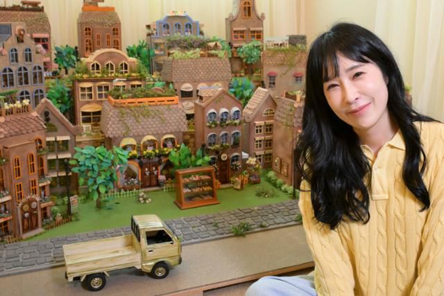 허정윤 작가가 5년 넘게 공들여 만든 그림책 '껌딱지 친구, 껌지와 딱지'의 배경이 된 '껌지 마을'을 뒤로 한 채 미소짓고 있다. 강예진 기자