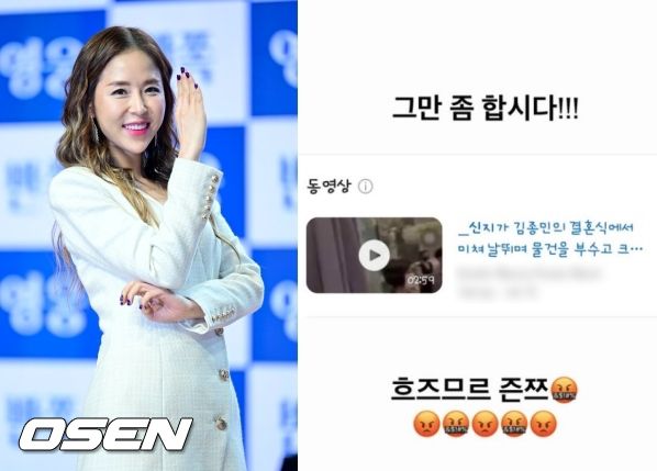 공개된 사진은 한 영상의 섬네일을 캡처한 것으로, 영상에는 ‘신지가 김종민의 결혼식에서 미쳐 날뛰며 물건을 부수고’라는 제목이 적혀 있다.