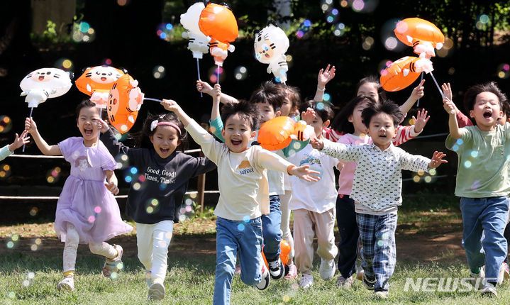 [서울=뉴시스] 추상철 기자 = 어린이날을 사흘 앞둔 지난해 5월 2일 오전 서울 송파구 올림픽공원 한성백제 박물관 앞 지구촌공원에서 송파구청 어린이집 원생들이 비눗 방울 놀이를 하며 즐거운 시간을 보내고 있다. 2024.05.02. scchoo@newsis.com |