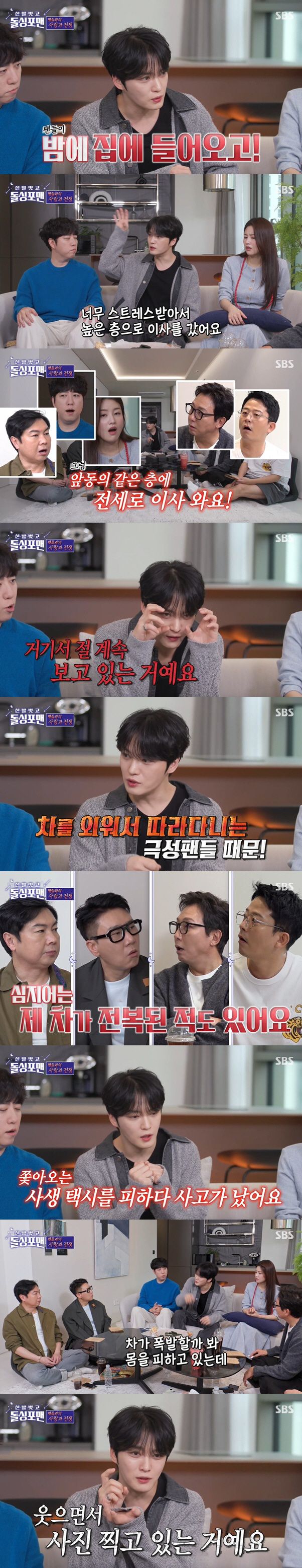김재중은 "밤에 집에 들어온다. 어떻게든 들어온다. 너무 스트레스 받아서 높은 층으로 이사를 갔더니 앞동의 같은 층에 전세로 이사온다. 거기서 절 계속 감시하고 있다. 높은 층에 살면서 밖을 본 적이 없다. 그래서 반지하 1층 집으로 이사갔더니, 위에서 계속 지켜보더라"고 도를 넘은 팬심에 고통 받았던 지난날을 떠올렸다.