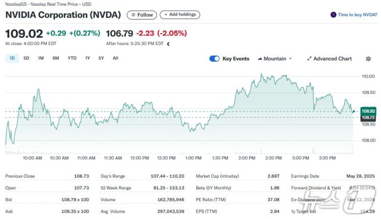 29일(현지시간) 뉴욕증시 시간외거래에서 엔비디아는 2.05% 하락한 106.79달러를 기록하고 있다.
