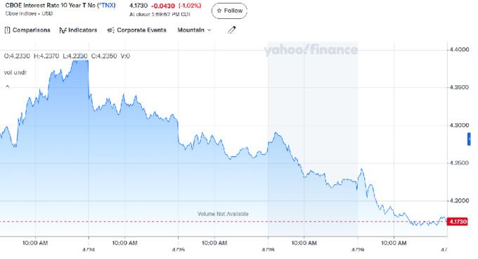 이날 뉴욕채권시장에서 벤치마크인 10년물 미 국채 금리는 3.5bp(1bp=0.01%포인트) 하락한 4.181%로, 4월 8일 이후 최저로 밀렸다.