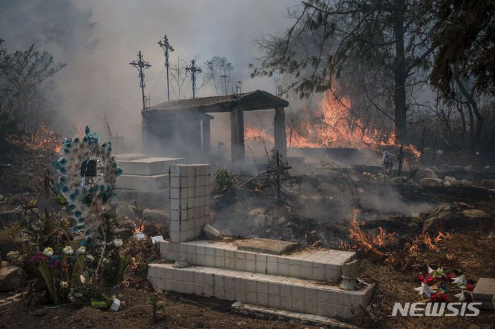 [노갈레스=AP/뉴시스]  멕시코 베라크루스주 노갈레스의 공동묘지 일부가 지난 해 3월 25일 산불에 타고 있는 광경.  베라크루스주의 212개 도시 시장선거를 앞두고 여당 후보 한명이 무장괴한 습격으로 숨지는 사건이 4월 29일 발생했다. 2025. 04. 30.