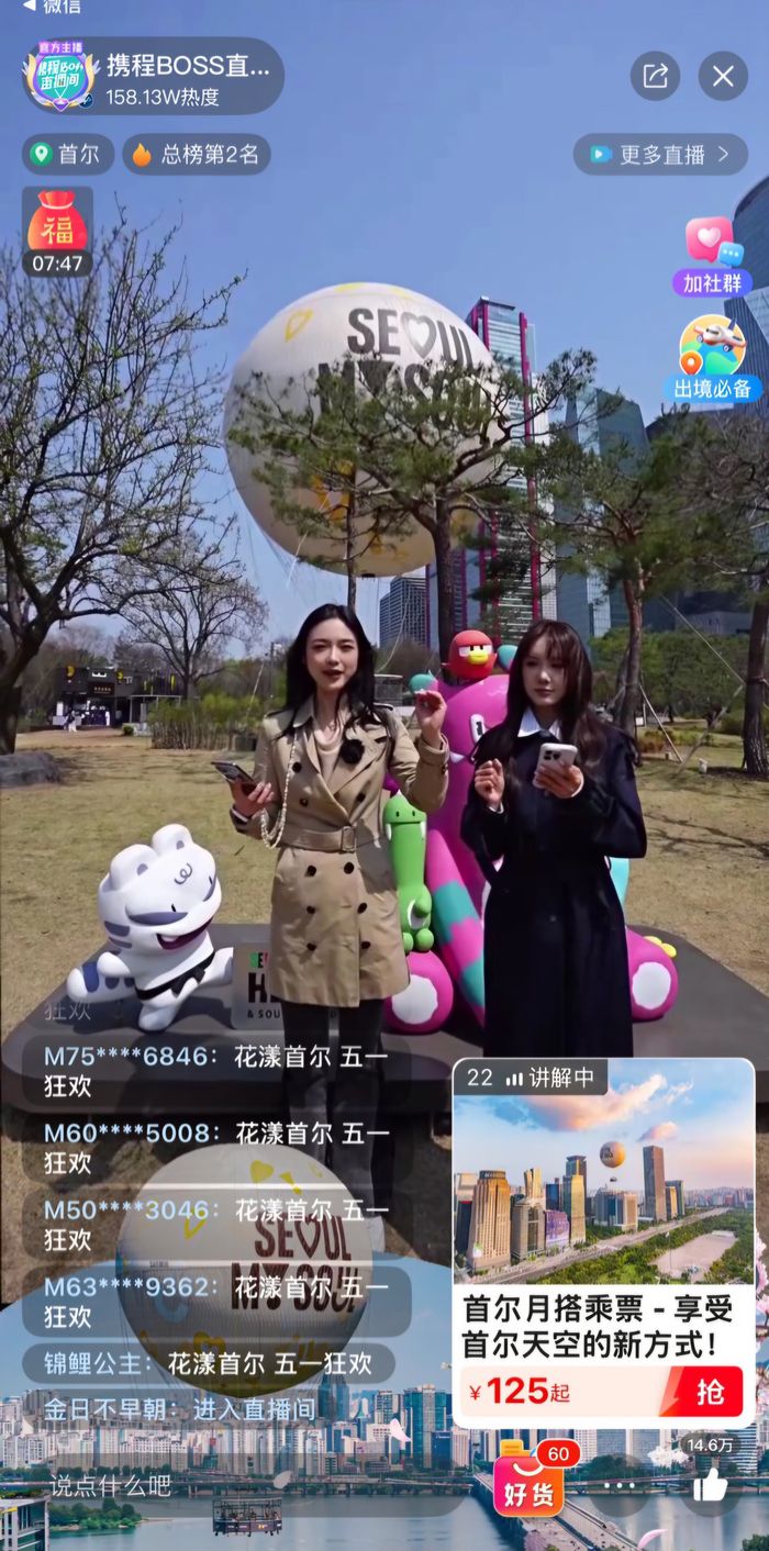 서울시와 서울관광재단이 지난 4월 9일 중국 여행 플랫폼 씨트립과 진행한 라이브커머스인 ‘보스 라이브 쇼’에 접속자 1548만명이 몰렸다. 총 매출은 30억3000만원에 달했다.
