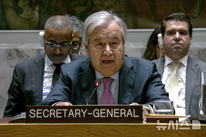 [뉴욕=AP/뉴시스]안토니오 구테흐스 유엔 사무총장이 국제적 지지를 받아온 이스라엘과 팔레스타인의 '2개국 해법'이 소멸위기에 처했다며 4월 29일 안보리 연설에서 경고를 했다.  사진은 지난 해 10월 열린 유엔 안전보장이사회(안보리) 중동 문제 공식회의에 참석해서 발언하는 구테흐스 사무총장. 2025.04.30.
