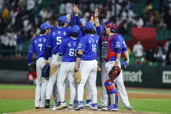 침묵이 깨진 것은 8회였다. 무사 만루 상황에서 노경은의 폭투로 3루 김성윤이 홈으로 들어왔고 9회에 김성윤이 적시타를 터뜨리며 사실상 승리에 쐐기를 박았다. 마무리 김재윤이 상대 타자 세 명을 뜬공 잡아내고 경기 빗장을 걸어잠갔다.