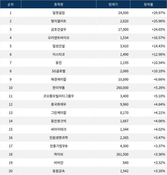 6위 이스타코(015020)는 현재가 1,490원으로 12.96% 급등 중이다. 7위 웅진(016880)은 현재가 1,195원으로 10.34% 상승 중이다. 8위 SG글로벌(001380)은 현재가 2,060원으로 10.10% 상승 중이다. 9위 애경케미칼(161000)은 현재가 10,890원으로 6.66% 상승 중이다. 10위 한미약품(128940)은 현재가 260,000원으로 5.26% 상승 중이다.