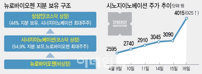 시너지이노베이션은 뉴로바이오젠 기술이전 소식이 알려진 16일 주가가 전일 3090원에서 4015원으로 올라 상한가(29.93%)를 기록했다. 4월 10일부터 주가가 상승해 16일까지 5거래일 연속 강세를 보였다. 해당 기간 주가 상승률은 54.7%에 달한다. 상상인 주가도 전일 1920원이던 주가가 16일 2395원으로 마감, 무려 24.7% 올랐다. 특히 시너지이노베이션의 경우 390억원 규모로 발행된 14회차 전환사채(CB) 중 116억원어치에 대한 전환 청구가 이뤄졌다. 그동안 주가 부진으로 풋옵션 우려가 있었지만, 주가 상승으로 전환 청구가 이뤄진 것으로 추정된다.