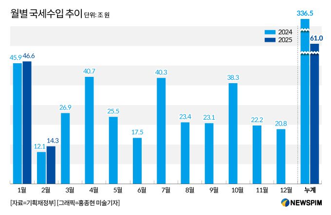 이 중 법인세 수입이 크게 늘면서 전체 증가폭을 견인했다. 지난달 법인세는 21조원으로 전년 동월보다 5조8000억원(38.0%) 늘었다. 12월 결산법인의 2024년 사업 실적이 개선된 사실에 영향을 받았다.