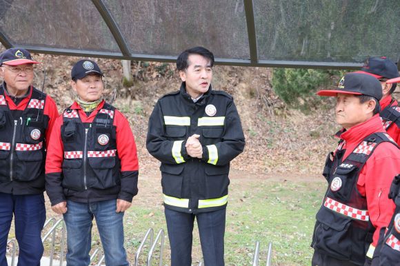 최재형(왼쪽에서 세번째) 보은군수가 산불진화대원들을 격려하고 있다. 보은군 제공.