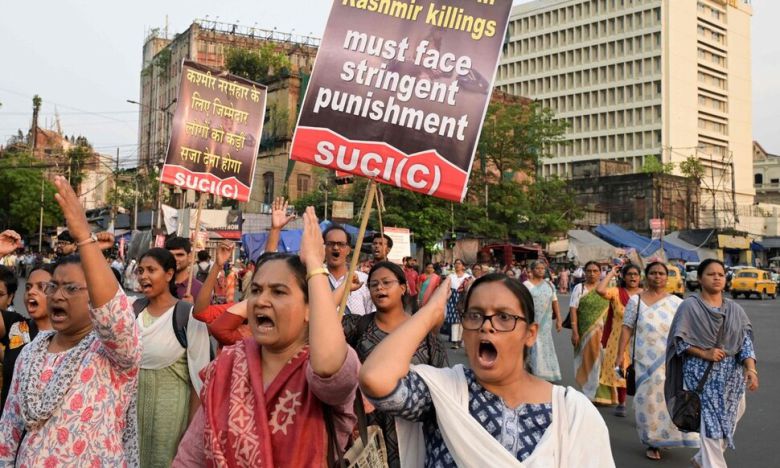 29일 인도 콜카타에서 인도 사회주의 정당 ‘사회주의통합센터’(SUCI)가 지난 22일 카슈미르 파할감의 민간인 테러 사건에 대해 비판하며 행진하고 있다. AFP 연합뉴스