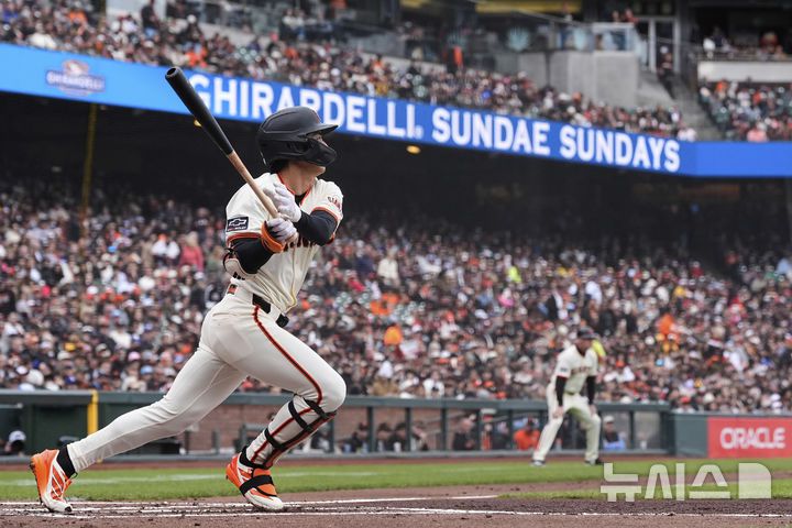 [샌프란시스코=AP/뉴시스] 샌프란시스코 자이언츠의 이정후가 27일(현지 시간) 미 캘리포니아주 샌프란시스코 오라클 파크에서 열린 2025 메이저리그 텍사스 레인저스와의 경기 1회 말 우전 안타를 치고 있다. 이정후는 4타수 1안타를 기록했고 샌프란시스코는 9회 말 상대의 잇따른 실책으로 3-2 역전승을 거뒀다. 2025.04.28. |