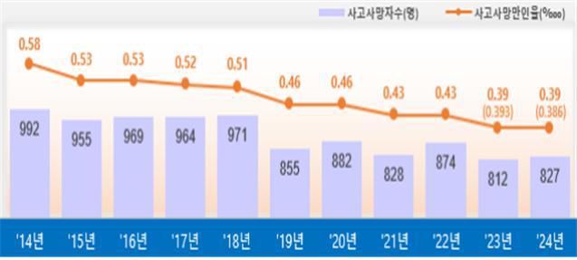 지난해 유족급여 승인 사고사망자 수는 827명으로, 전년 812명 대비 15명 증가했다. 사고사망만인율은 0.39‱로, 전년과 동일한 수준을 보였다.
