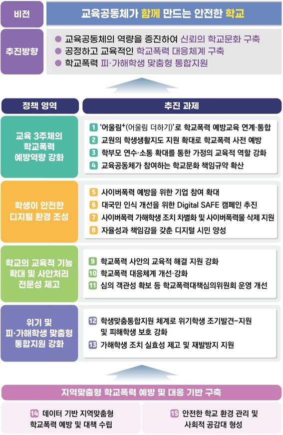 한편, 이번 5차 계획은 현장의 의견과 교육 환경의 변화를 반영해 관계 부처와 합동으로 마련했다. '교육 공동체가 함께 만드는 안전한 학교'를 비전으로 ▲교육 3주체(학생·교원·학부모)의 학교폭력 예방 역량 강화 ▲학생이 안전한 디지털 환경 조성 ▲학교의 교육적 기능 확대 및 사안 처리 전문성 제고 ▲위기 및 피·가해 학생 맞춤형 통합 지원 강화 ▲지역 맞춤형 학교폭력 예방 및 대응 기반 구축의 5대 정책 영역 15개 과제로 구성했다.